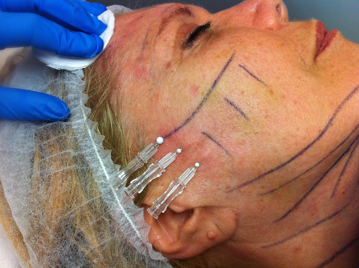 Si “lifta” il viso con sottilissimi fili inseriti sotto il derma nei punti critici: guance, zigomi , mascella, mento e collo.